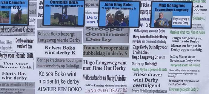 en links bovenstaand bord met krantenkoppen van heel veel Derby's.