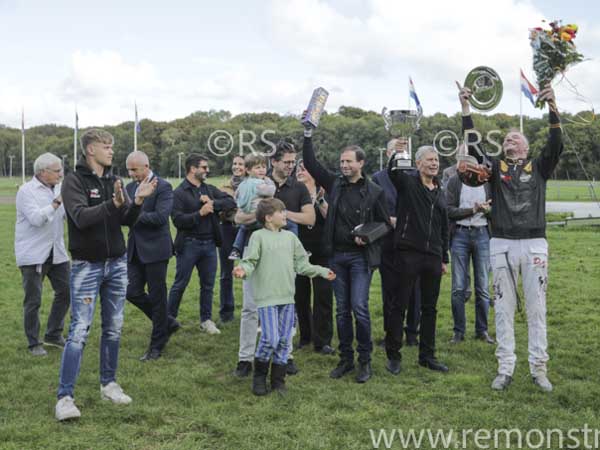 zien we in het midden op de rug trainer Dion Tesselaar, omringd door de familie Folkers. Ger Folkers staat met gebalde vuisten te genieten.