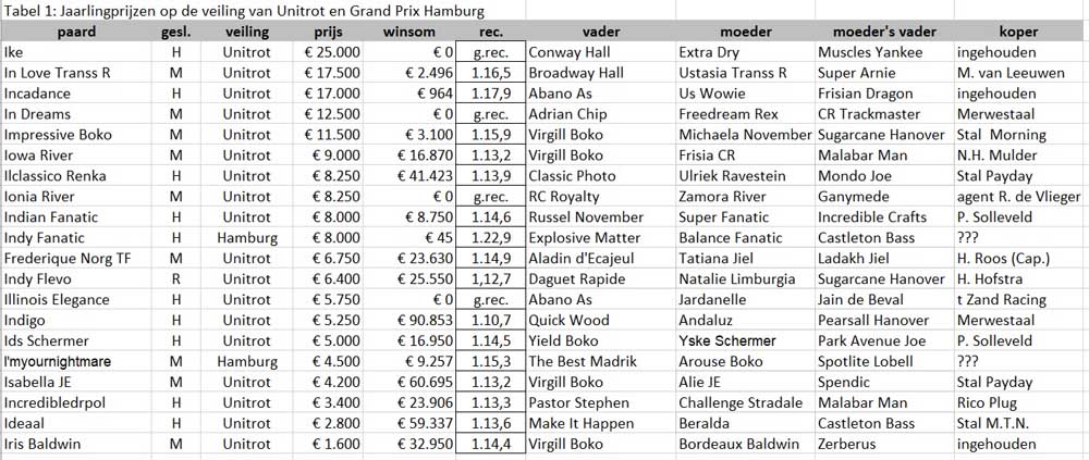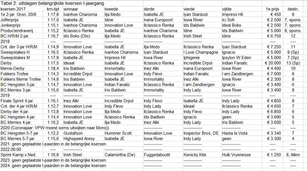 In Tabel 6 wordt de I-jaargang vergeleken met de voorgaande acht. Totaal zijn 79 I-tjes in de baan gekomen, een prijs(je) verdienend. In veel opzichten is deze jaargang veel minder dan de vorige twee. Er ontbreken echte toppers, waardoor de gemiddelde winsom aan de lage kant is gebleven. Je zou verwachten dat met minder veulens de gemiddelde kwaliteit door betere selectie omhoog zou gaan, maar dat is niet het geval. Het starterspercentage van deze jaargang is gemiddeld. Alle paarden samen hebben € 1.250.000 verdiend, waarvan € 656.000 in NL en € 594.000 in het buitenland. In deze jaargang telden we 28 geëxporteerde paarden, inde vorige 30. Eigenlijk zou NDR de door Gerard ter Schure gevonden winsommen regelmatig over moeten nemen en vastzetten in Euro’s om latere valutaschommelingen van diverse kronen te voorkomen.