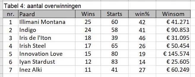In tabel 4 staan de paarden met meeste overwinningen. Slechts 7 paarden wonnen 10 of meer koersen. Maar ook dat zal te maken hebben met het lagere aantal veulens. Illimani Montana en Indigo staan ruim voorop met mooie winpercentages.