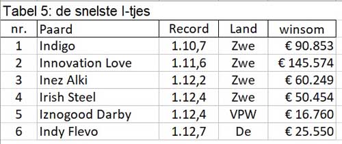 36 I-paarden hebben een record onder de 1.15,0. Bij de vorige jaargang waren dat er 43, maar die jaargang was groter. In tabel 5 staan de 6 paarden met records onder 1.13,0. Vorige jaargang waren dat er 16. Indigo was de snelste en de enige onder de 1.11. Er staat bij in welk land het record is gevestigd.De meeste record zijn gelopen in Zweden. Paarden, die daar niet zijn gestart, zijn dus in het nadeel en de records, die in NL zijn gelopen, moeten een hoge waardering krijgen. IznogoodDarby liep zijn record op Victoria Park.