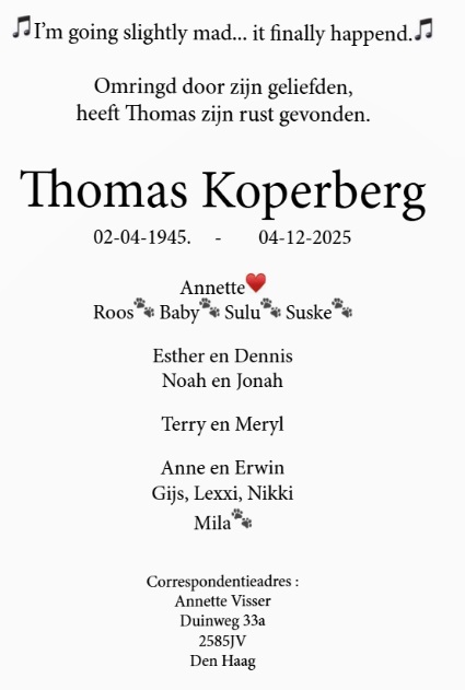 Boven: Rouw-advertentie voor Thomas Koperberg