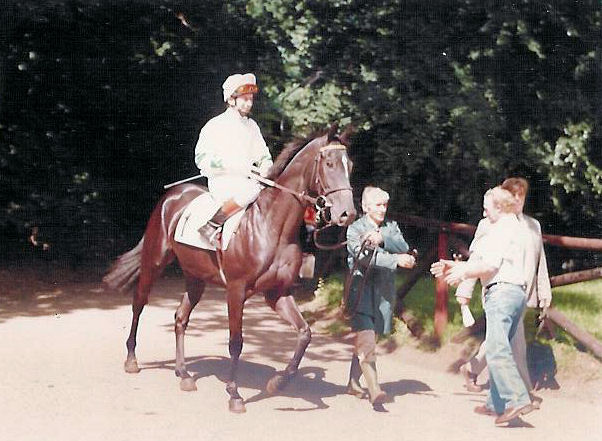 in de St. Leger 1987. Langs de reling blijft Ros Fandango steken