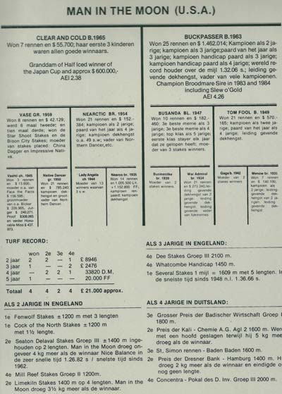 Ruim vijftig jaar geleden werd op 27 februari 1974 in Amerika de bruine volbloed hengst Man In The Moon geboren van Buckpasser (1963) uit Clear and Gold (1965) van Nearctic. Buckpasser was een toonaangevende hengst in Amerika. De vader van Buckpasser is Tom Fool/1949 en zijn grootvader is Menow/1935. Kortom een eersteklas afstamming.