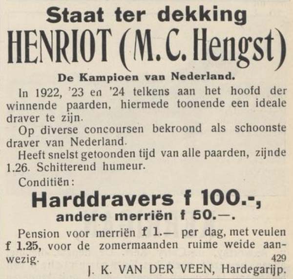 In oktober 1920 werd de 6-jarige Henriot door A.L. van Coeverden in de Nederlandsche Sport te koop aangeboden. Als aanbeveling stond er bij dat hij een gouden medaille had behaald als schoonste draver op het Concours Hippique in Den Haag op 20 augustus 1920.