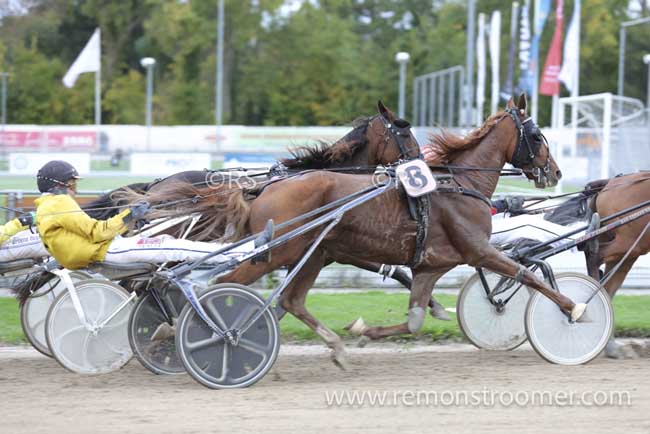 Boven: 4,5 Km 2023: De buitenlandse rijders in het laatste band snapten niet veel van de startprocedure in Alkmaar. Het duurde maar en duurde maar en toen was de eerste start ook nog vals. Na de eerste geldige start sprong Jonne Cavallo aan de reling weg en kon niet meer worden gezet. Het veld moest er omheen en in de linkerbocht volgde een botsing en kwam Jaap van Rijn ten val. Hij kwam op zijn stuitje en heup terecht en bleef liggen. Voor de zekerheid is hij naar het nabij gelegen ziekenhuis gebracht. Zijn paard Garuda Fligny ging er rijderloos vandoor en kon na een ronde worden vastgepakt door Robin Bakker. Dat zien we hier. Robin heeft zo een ronde lang gereden, twee paarden in bedwang houdend. Toen kon Garuda Fligny door een omstander worden vastgegrepen. Petje af voor Robin Bakker. Wat een kracht heeft die man in zijn lijf! De koers werd met een half uur vertraging hervat, zonder Jonne Cavallo. Jaap van Rijn kon 's avonds naar huis en reed een paar dagen later weer koersen in Wolvega.