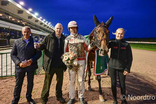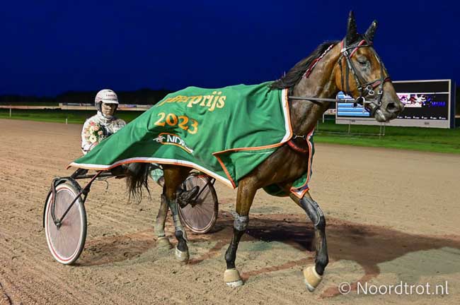 hun zege in de Merrie Trofee. Links trainer Paul Hagoort