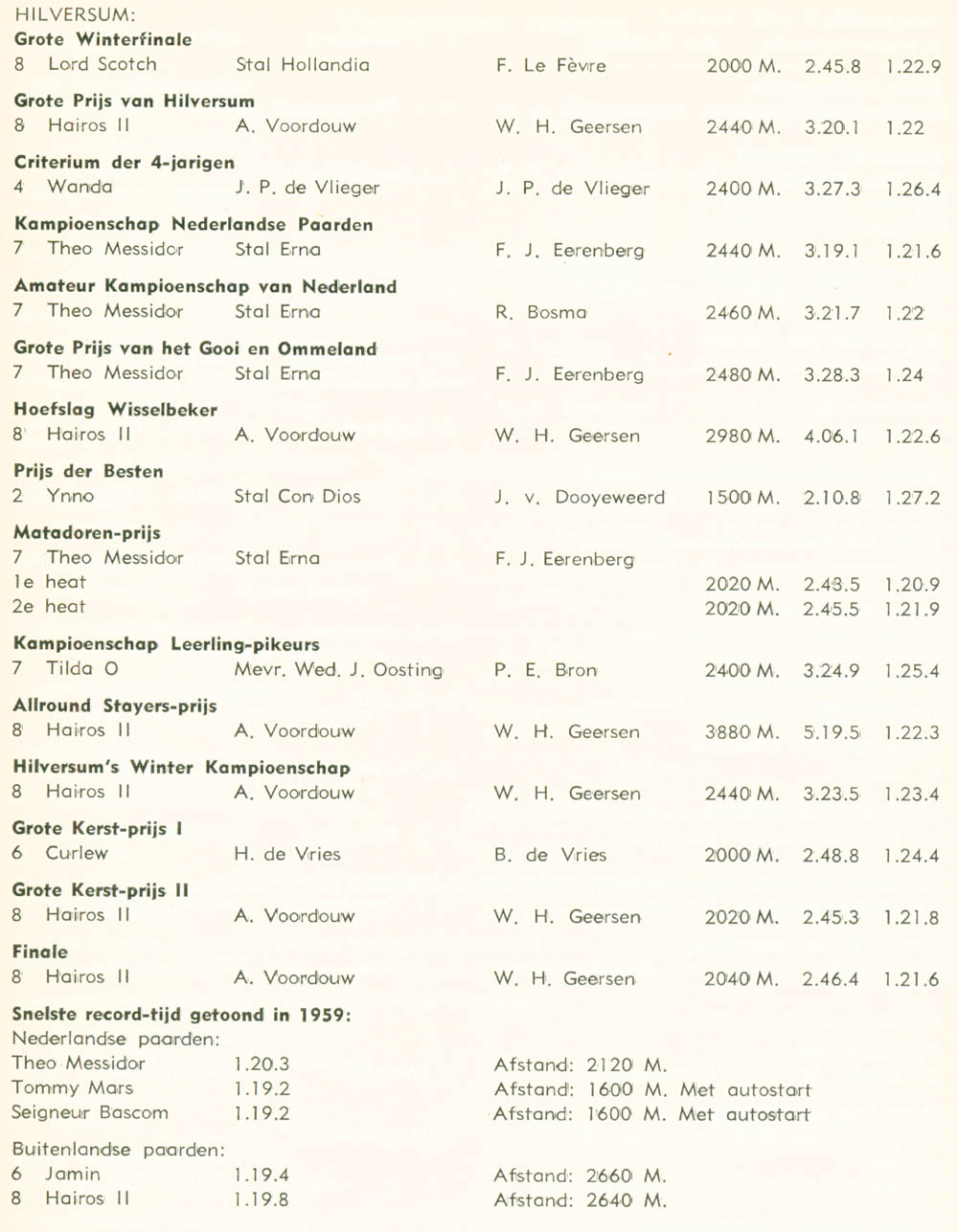 In Joinville-le-Pont overlijdt op 31 december 1959 Koos Jansen, lange tijd vooraanstaand trainer in Frankrijk. Grote successen had Jansen met Doelman P, de vader van O Lapize, die vanuit ons land naar Italie is uitgevoerd. Ook was hij de trainer van de bekende Pharaon en van Fragilite en Rhyticere, resp. grootmoeder en moeder van Gelinotte. Nog maar enkele jaren geleden gaf Koos Jansen op verzoek nog adviezen om het peil van de ruiterdraverijen te verhogen.